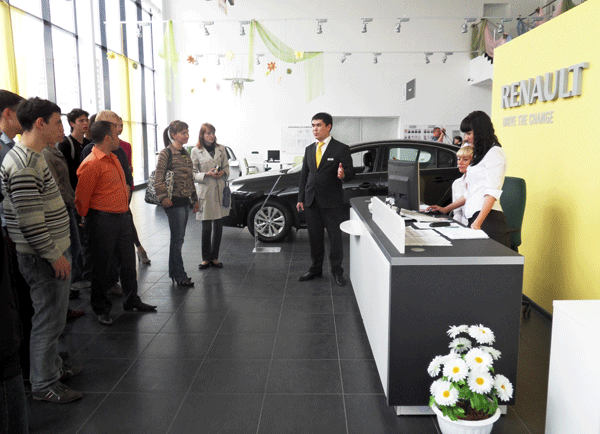 После этого экскурсанты ознакомились с работой отдела продаж, сотрудники которого встречают клиентов, оформляют документы на покупку автомобиля и его обслуживание, занимаются кредитованием клиентов при покупке автомобиля, страхованием автомобилей.